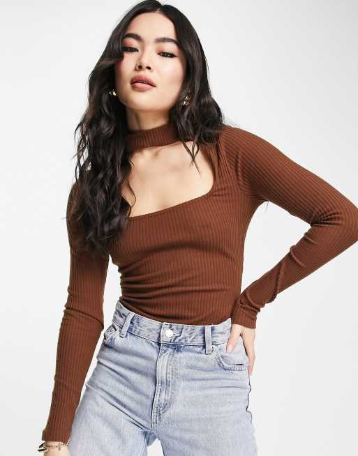 ASOS DESIGN choker neck long sleeve bodysuit in chocolate