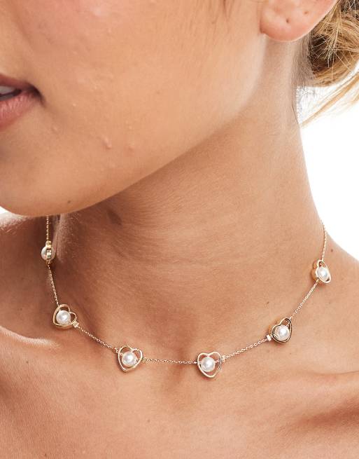 ASOS DESIGN choker necklace with faux pearl and heart detail in gold tone