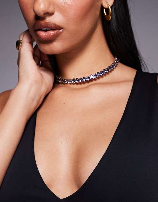ASOS DESIGN choker necklace with faux purple sparkly crystal detail in gold tone