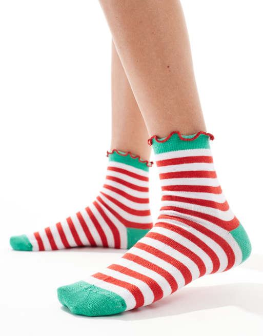 ASOS DESIGN Christmas ankle length elf stripe sock with metallic frill edge