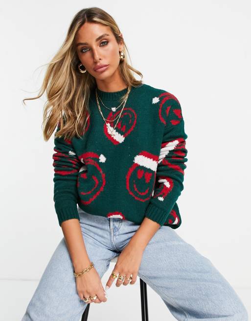 ASOS DESIGN Christmas jumper with smile face pattern in green