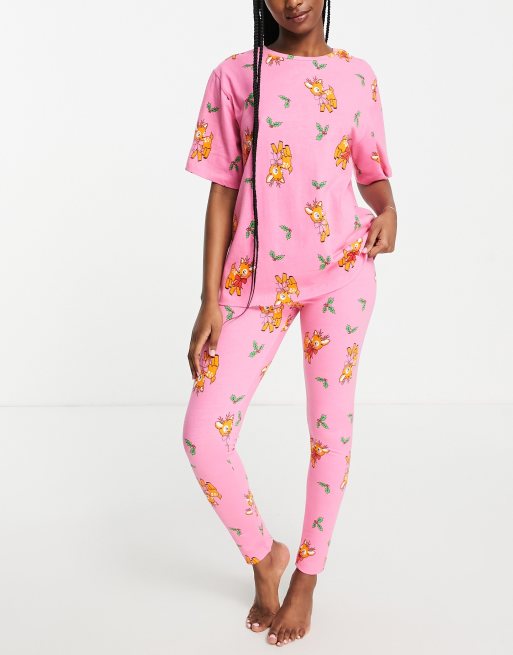 ASOS DESIGN Christmas reindeer oversized tee & legging pyjama set in pink