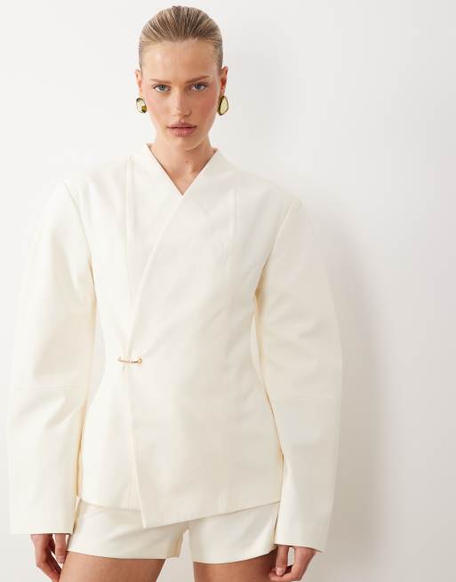 ASOS DESIGN cinched waist blazer suit with hardware detail in cream