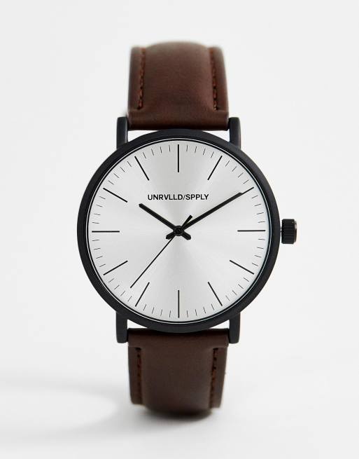 ASOS DESIGN classic watch with matte black case and faux leather strap in brown