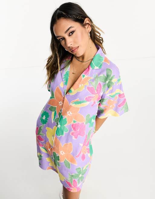 ASOS DESIGN Co ord bowling shirt mini dress in purple floral print