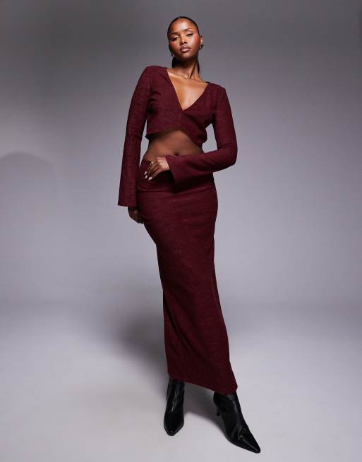 ASOS DESIGN co-ord brushed rib column maxi skirt in burgundy