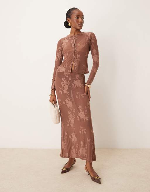 ASOS DESIGN co-ord button up long sleeve cardigan and maxi skirt in brown devore