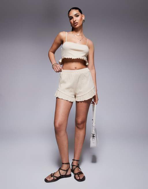 ASOS DESIGN co-ord crinkle flippy shorts with frill hem in stone