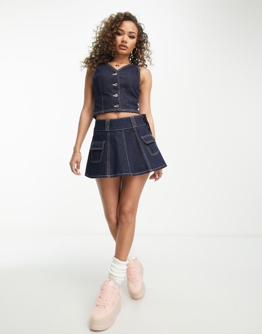 ASOS DESIGN co-ord denim mini skirt with pleats in blue