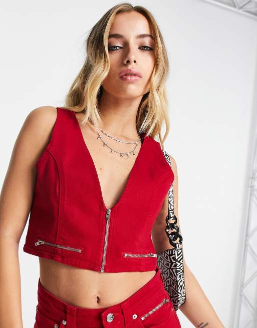 ASOS DESIGN co-ord denim waistcoat with zip details in red