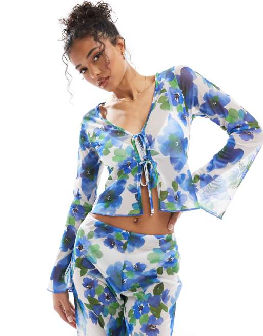ASOS DESIGN co-ord flared sleeve tie front mesh top in floral print