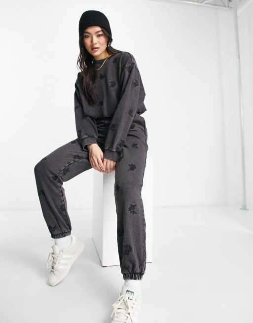 ASOS Design co-ord jogger & sweat with floral embroidery in washed black