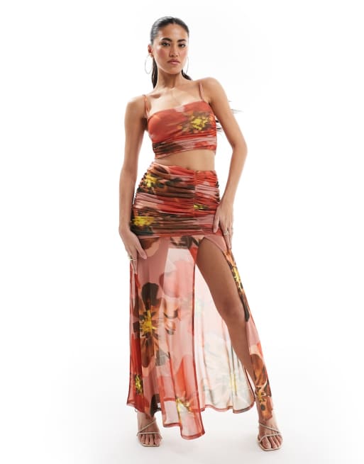 ASOS DESIGN co-ord mesh ruched cami & skirt in large scale floral print