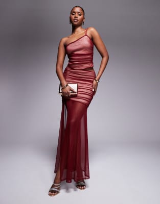 ASOS DESIGN co-ord mesh ruched maxi skirt with split detail in deep red