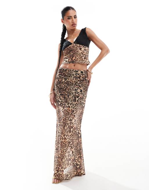 ASOS DESIGN co-ord mesh vest top with lace detail and skirt in leopard print