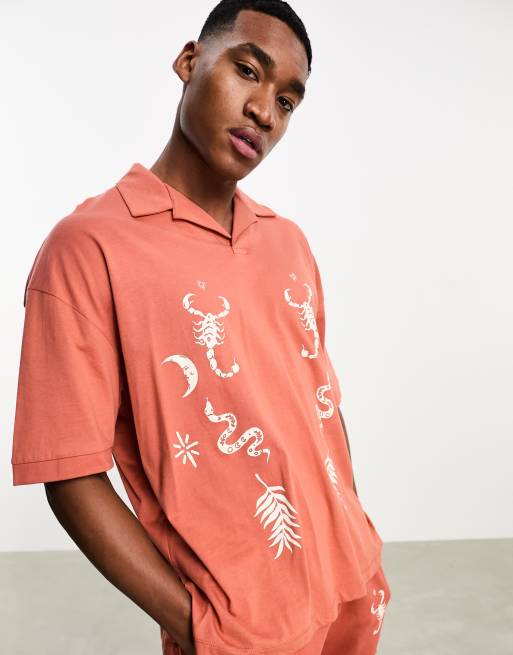 ASOS DESIGN co-ord oversized revere polo shirt in tan with front print detail