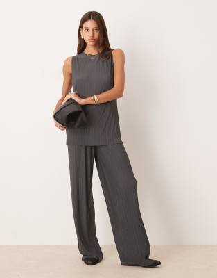 ASOS DESIGN co-ord pleat mesh longline sleeveless top and straight leg trouser in charcoal