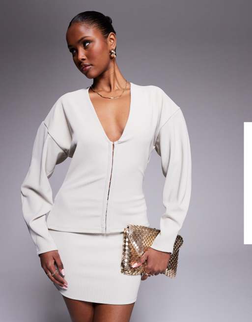 ASOS DESIGN co-ord ribbed balloon sleeve structured top in stone