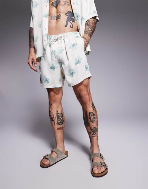 ASOS DESIGN co-ord satin shorts in mid length with floral print in neutral