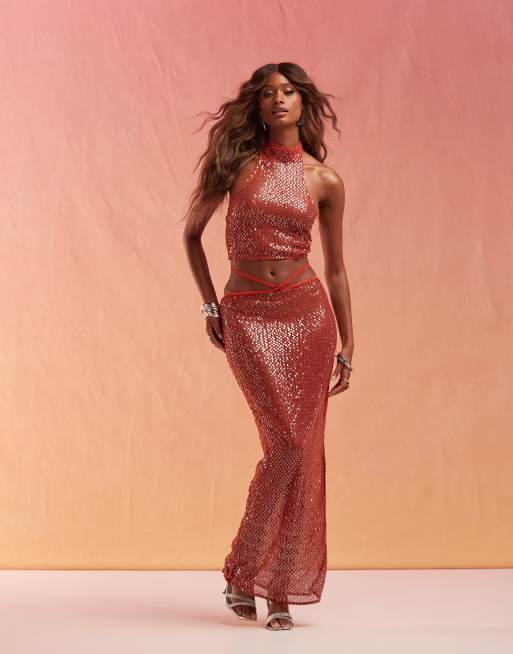 ASOS DESIGN co-ord sequin fishnet maxi skirt in burnt orange