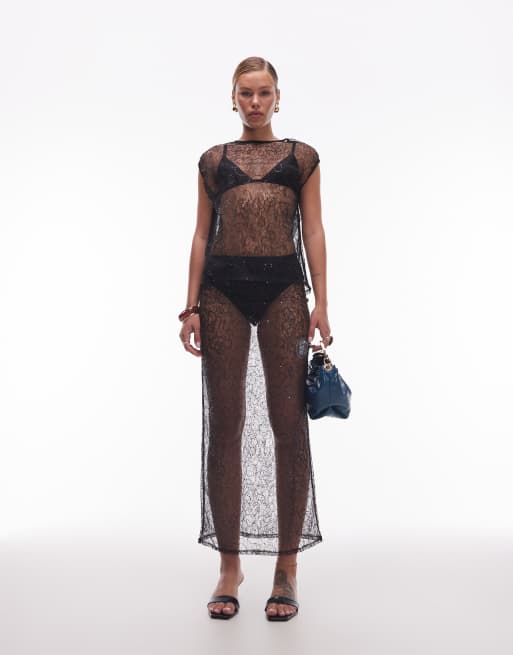 ASOS DESIGN co-ord sequin mesh sheer midi skirt in black