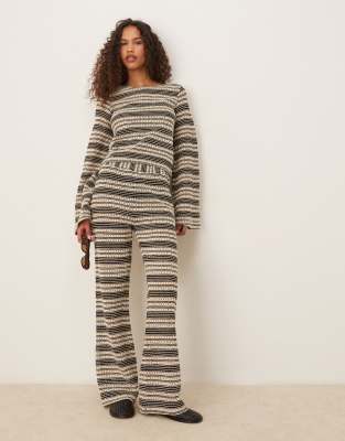 ASOS DESIGN co-ord stripe crochet stitch open tie back long sleeve top and flared trouser in mono