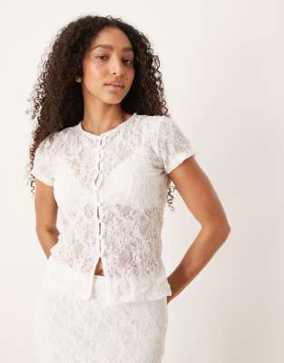 ASOS DESIGN co-ord textured lace button through sleeve top in ivory