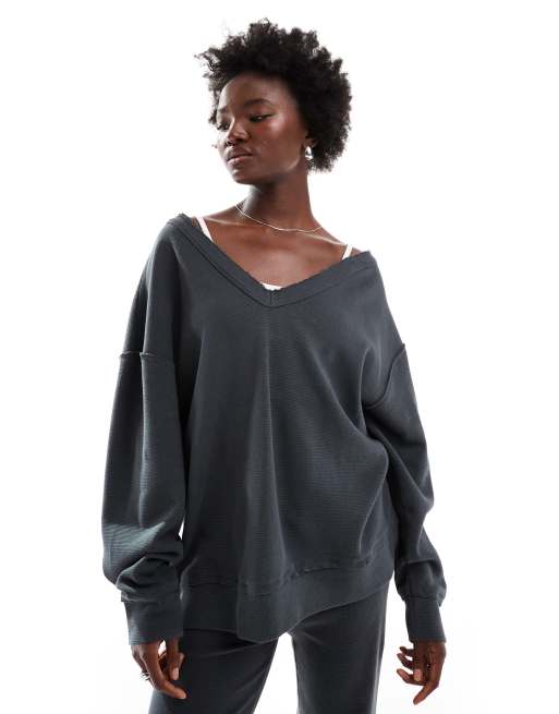 ASOS DESIGN co-ord waffle oversized off shoulder v neck sweatshirt in washed charcoal