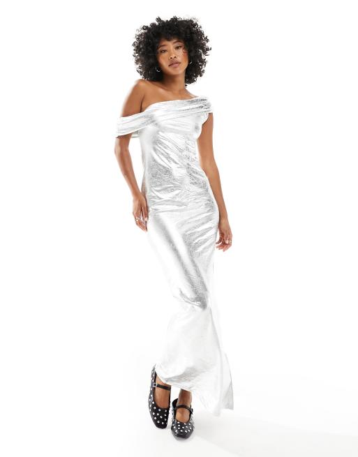ASOS DESIGN coated metallic one shoulder ruched maxi dress in silver