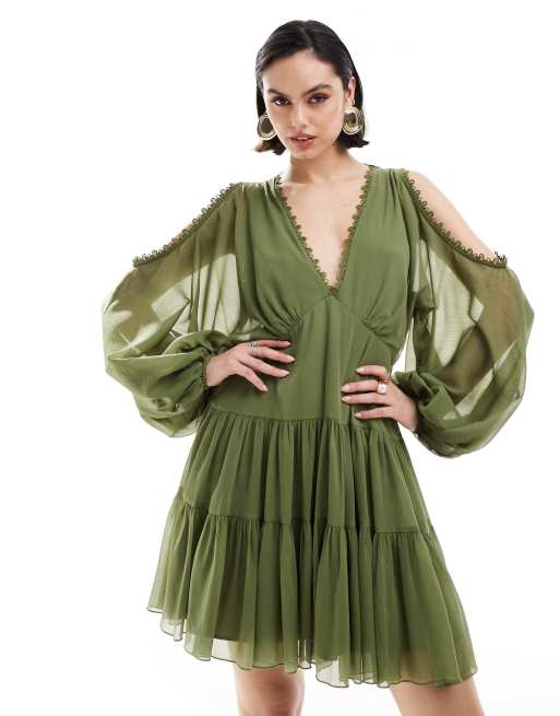 ASOS DESIGN cold shoulder tiered mini dress with lace insert in khaki