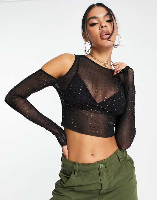 ASOS DESIGN cold shoulder top in black with pink crystal stud hotfix