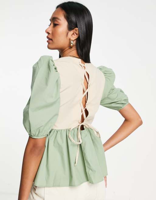 ASOS DESIGN colourblock cotton smock top with lace up back in beige and khaki