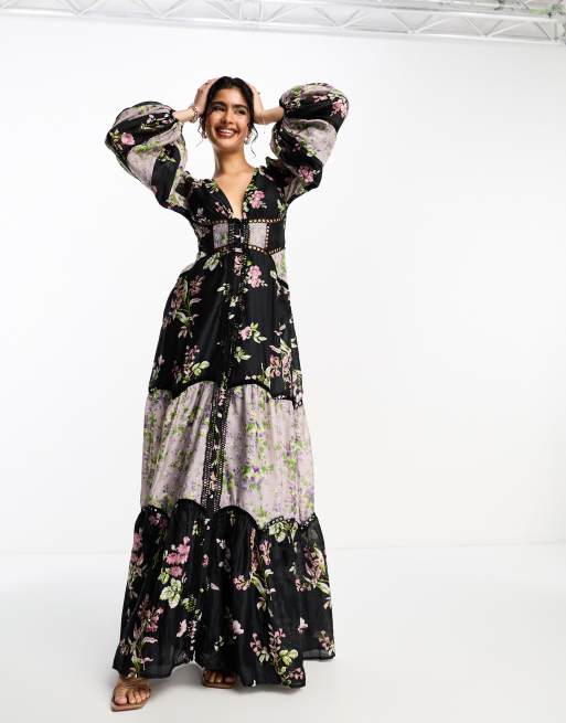 ASOS DESIGN colourblock print maxi dress with blouson sleeves in multi floral print