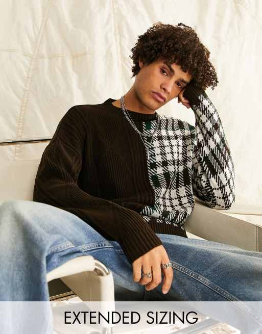 ASOS DESIGN contrast cable & check knitted jumper in brown