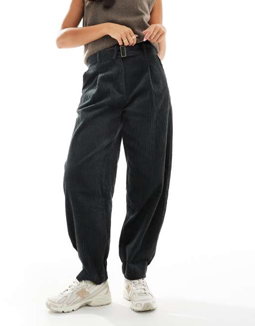 ASOS DESIGN cord barrel leg trousers with belt in grey