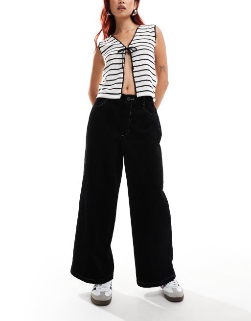 ASOS DESIGN cord cropped wide leg trouser with contrast stitch in black