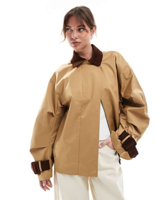 ASOS DESIGN cord cuff and collar short trench coat in stone