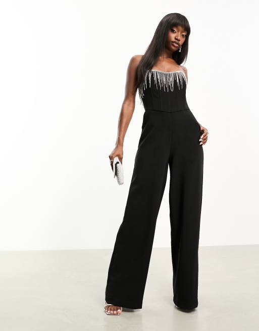 ASOS DESIGN corset jumpsuit with diamante fringe detail in black