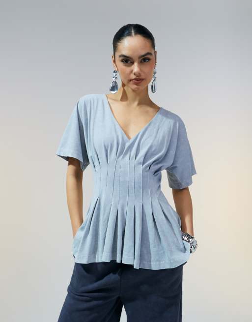 ASOS DESIGN corset waist tee with pleat detail in washed grey