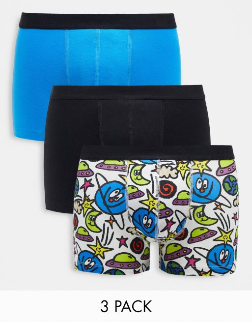 ASOS DESIGN cotton blend 3 pack trunks with cartoon space print in blue