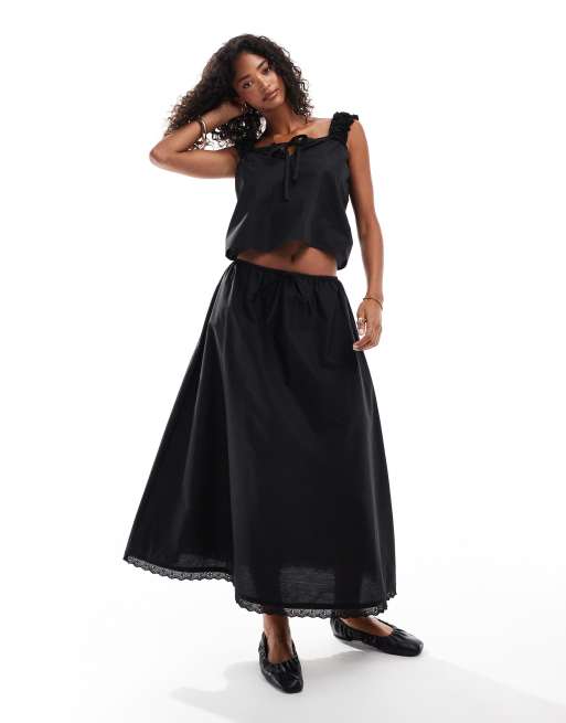 ASOS DESIGN cotton drawstring waist maxi skirt with broderie trim in black co ord