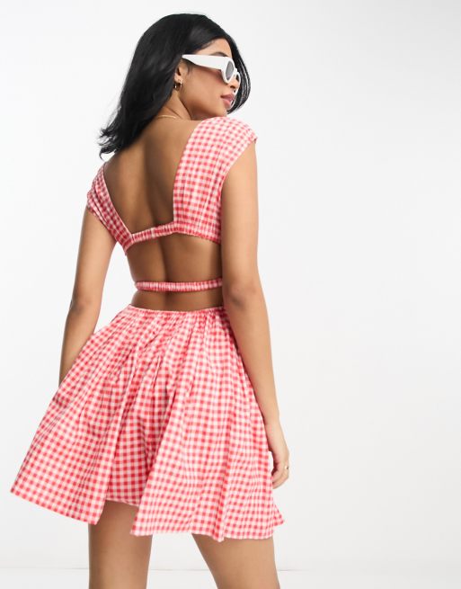 ASOS DESIGN cotton plunge button through mini sundress with elastic channel detail in red gingham
