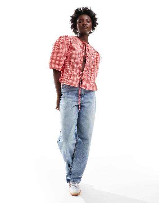 ASOS DESIGN cotton poplin tie front peplum blouse in red gingham
