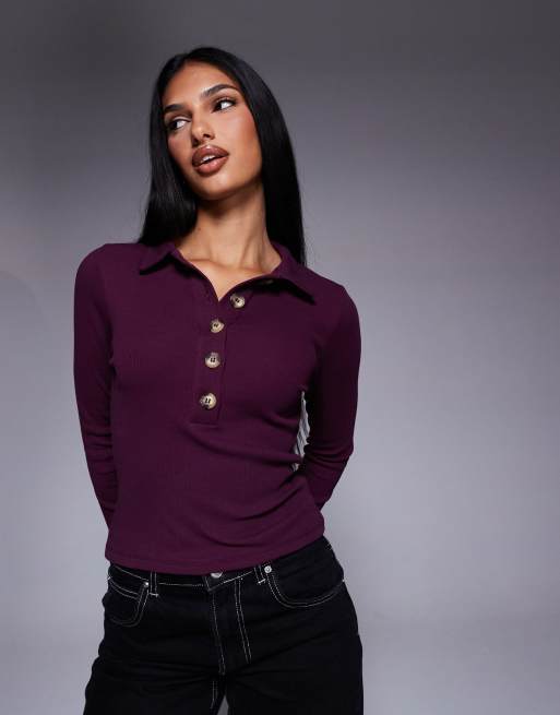 ASOS DESIGN cotton rib polo long sleeve top in berry
