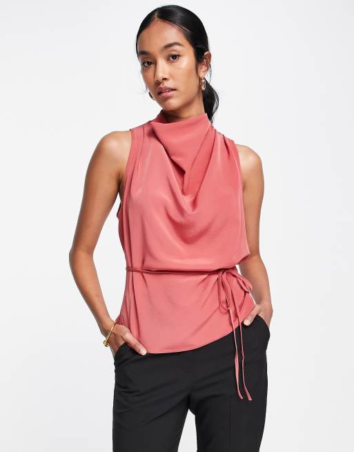 ASOS DESIGN cowl neck sleeveless blouse with skinny tie waist detail in wine