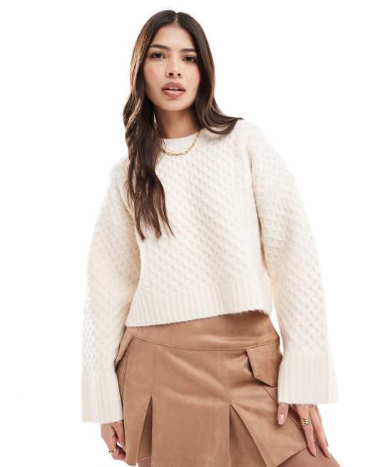 ASOS DESIGN crew neck boxy jumper with wide cuff in cable knit in cream