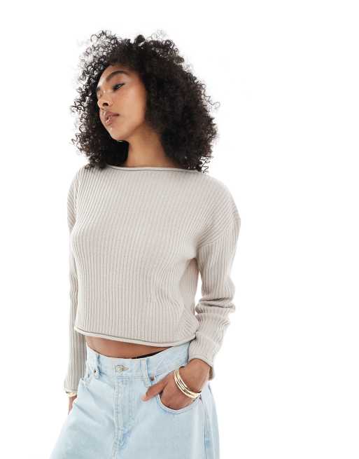 ASOS DESIGN crew neck boxy rib jumper with rolled edge in grey