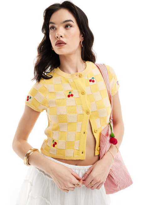 ASOS DESIGN crew neck cardigan with cherry embroidery in yellow