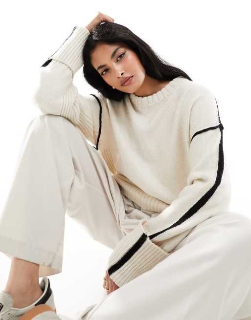 ASOS DESIGN crew neck jumper with contrast seams in cream