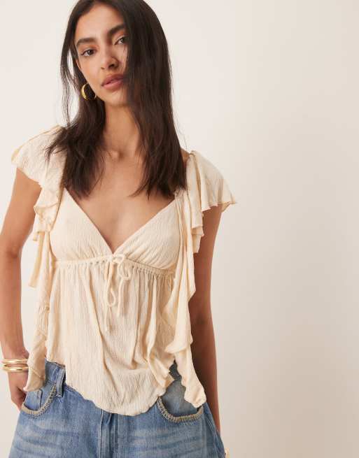 ASOS DESIGN crinkle flutter sleeve open back top in cream